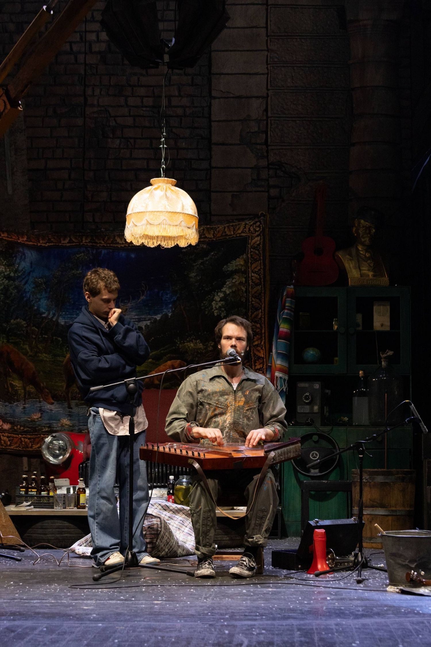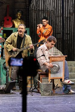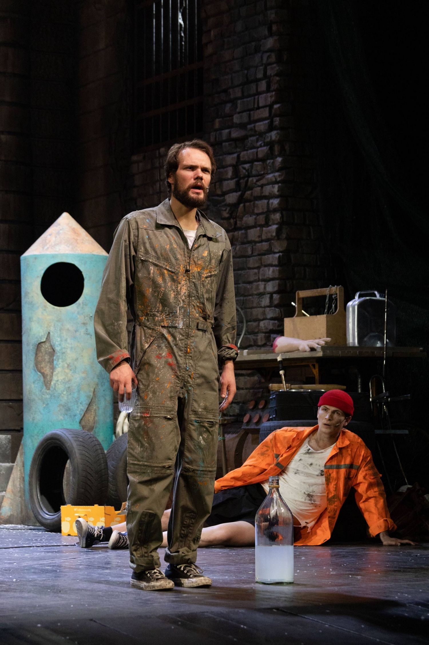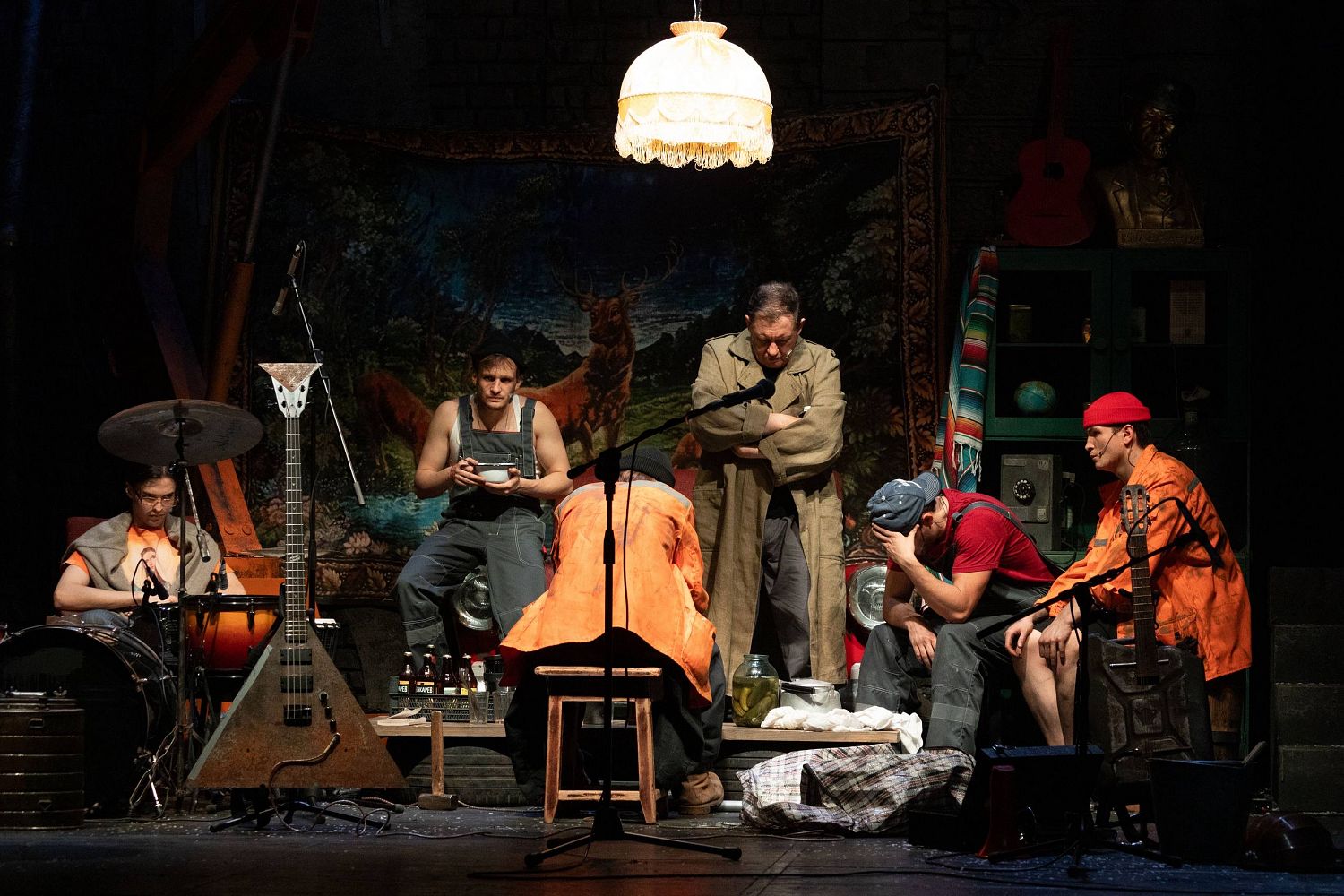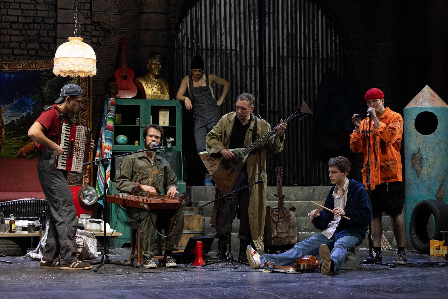 Наш спектакль начинается с музыкальной репетиции. Рок-группа из семи мужиков играет в гараже свои песни. Простые рабочие, которые после смены собираются вместе в одном из помещений промзоны, где они трудятся – по-настоящему отдыхают, музицируя и сочиняя. Они – современные прототипы семерых персонажей из поэмы Некрасова, которые, собравшись на столбовой дороге с разных концов Руси, когда-то задались вопросом: «Кому живётся весело, вольготно на Руси?..»