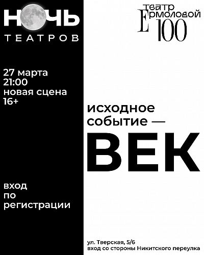 27 марта в Международный День Театра в Москве пройдет традиционная «Ночь театров» Наш вечер «Исходное событие – век», который состоится в рамках акции на Новой сцене, посвящён 100-летию Театра Ермоловой.